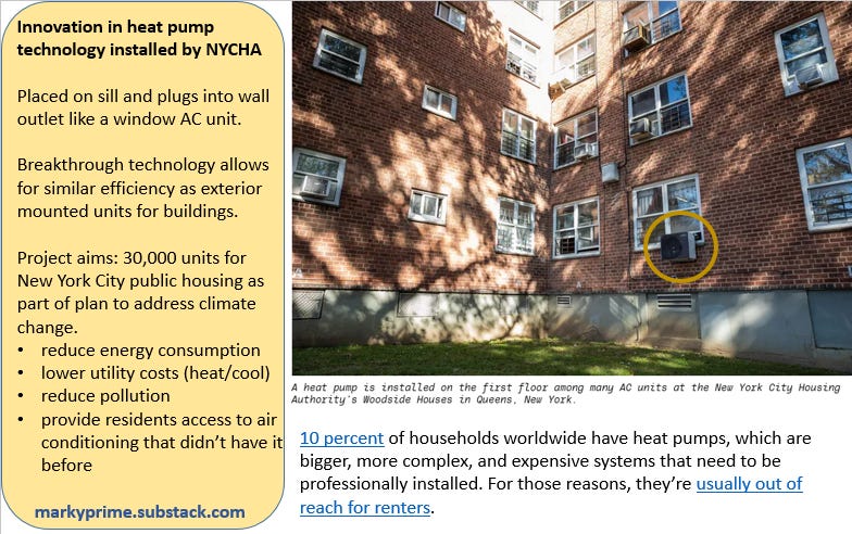 NYCHA is moving toward a goal of ending gas boiler use for heating by providing window heat pumps to public housing tenants (thereby providing heat and cooling for the same appliance unit)